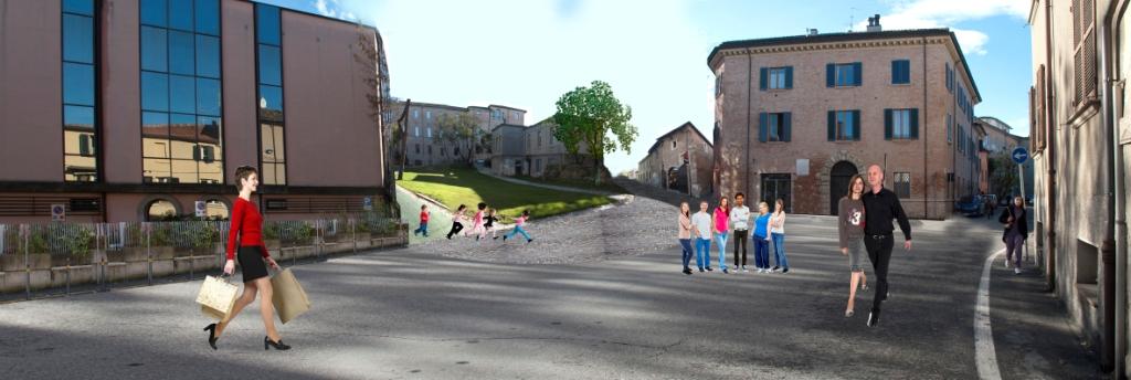 Pedonalizzata col fossato in continuum con le ali del Teatro Galli. La Piazza un intero continuum urbano riqualificato che arriva ai “Giardini delle Mimose”, aula del consiglio, Piazza San Martino;