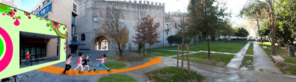 7) I BIMBI E LE MIMOSE – Giardino dei bimbi o delle Mimose, cambiano le parole, cambiano le funzioni. Da “Palazzo Garampi/del Comune” a CASA COMUNE, razionalizzazione degli spazi della politica, più spazi alla vita, meno alla politica. Al posto della sala del Consiglio: